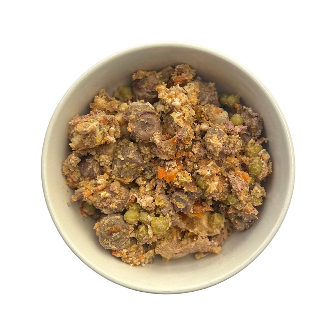 Ingredientes: Pollo 44% (20% de corazón, 60% de carne y 20% de hígado), Calabaza 9%, zanahoria 9%, Huevo 7%, Arroz 19%, Arvejas 5% , Aceite de soja 3% , Foodplement 3%, fosfato tricálcico menos del 1%